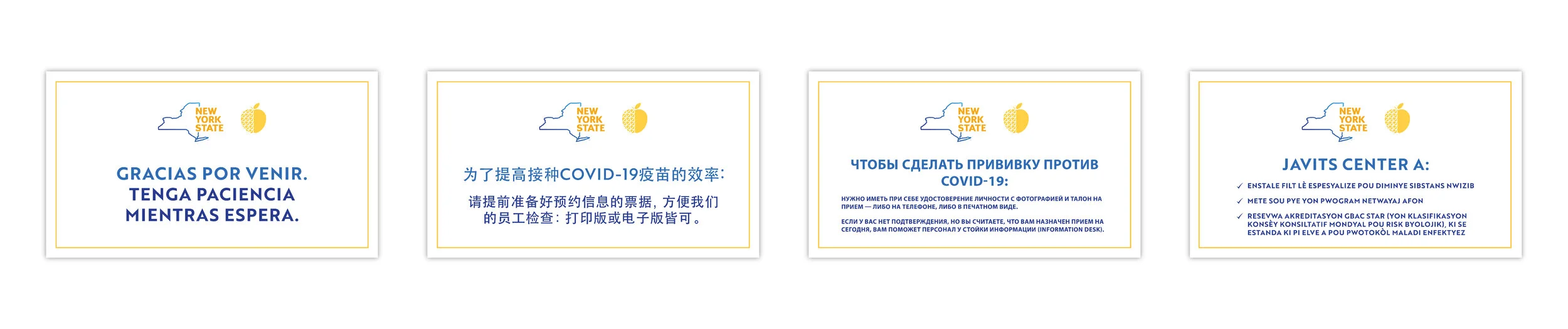 Vaccination Center signage was translated into 6 different languages — Spanish, Chinese, Korean, Russian, Bengali, and Haitian Creole — so that more visitors would be able to read the information provided.